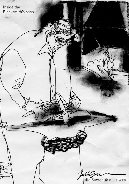 Mandelman's paintings on the walls seemed much louder than Cage's ambient sounds. My friends and I (there were a few of us drawing in first two rows) were so conscious of the sound of our own pens and pencils on paper during this performance-we'd occasionally freeze and wait for the fragile quietness to pass.